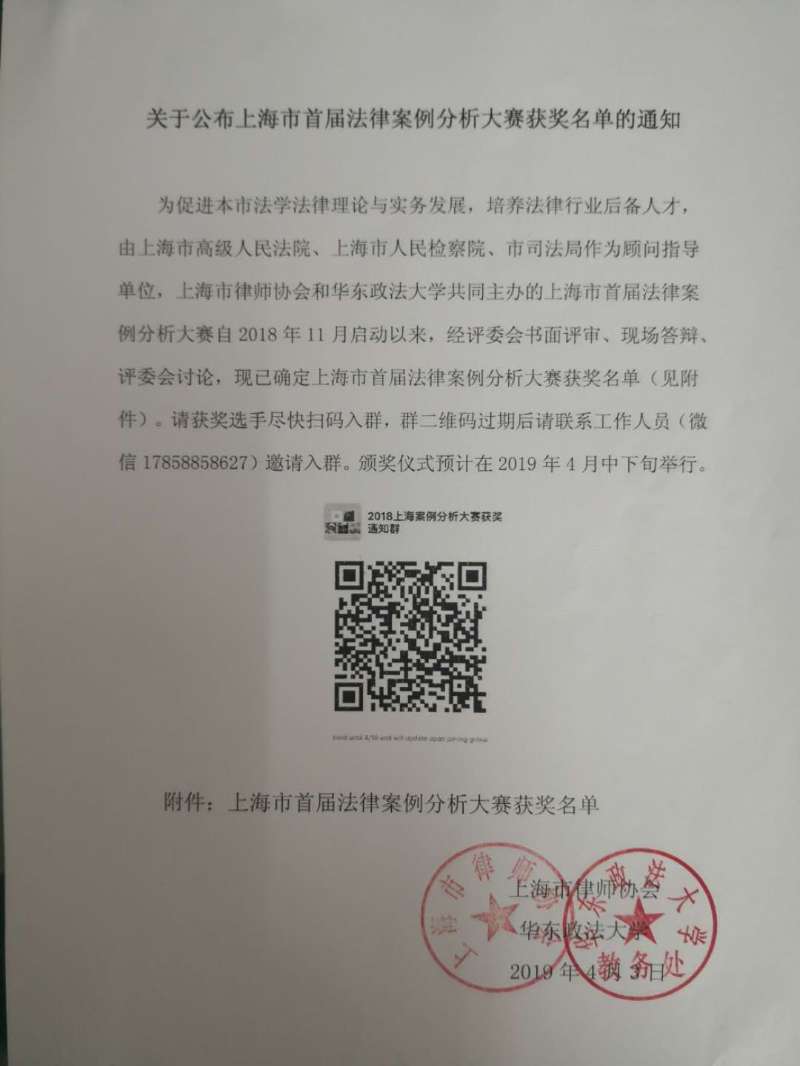 为促进本市法学法律理论与实务发展,培养法律行业后备人才,由上海市高级人民法院、上海市人民检察院、市司法局作为顾问指导单位,上海市律师协会和taptap点点共同主办的上海市首届法律案例分析大赛自2018年11月启动以来,经评委会书面评审、现场答辩、评委会讨论,现已确定上海市首届法律案例分析大赛获奖名单(见附件)。请获奖选手尽快扫码入群,群二维码过期后请联系工作人员(微信17858858627)邀请入群。颁奖仪式预计在2019年4月中下旬举行。