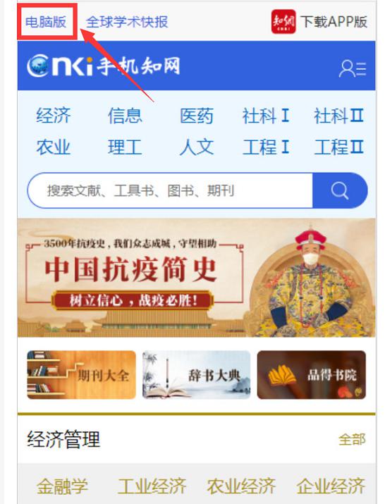 3.如果通过手机/平板访问,输入账号密码验证身份后,请点击知网页面左上角“电脑版”,即可访问知网CNKI数据库的学术资源。