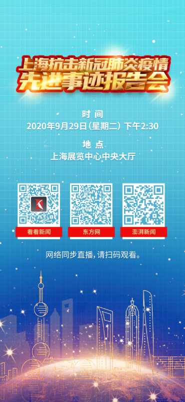 为学习贯彻全国抗击新冠肺炎疫情表彰大会精神,弘扬伟大抗疫精神,讲述上海各行各业特别是医疗卫生领域抗击疫情的感人故事,进一步凝聚砥砺奋进的力量,市委宣传部会同市教卫工作党委、市卫生健康委等部门共同举办上海防控新冠肺炎疫情先进事迹报告会,首场报告会将于9月29日下午2:30在上海展览中心举行。
