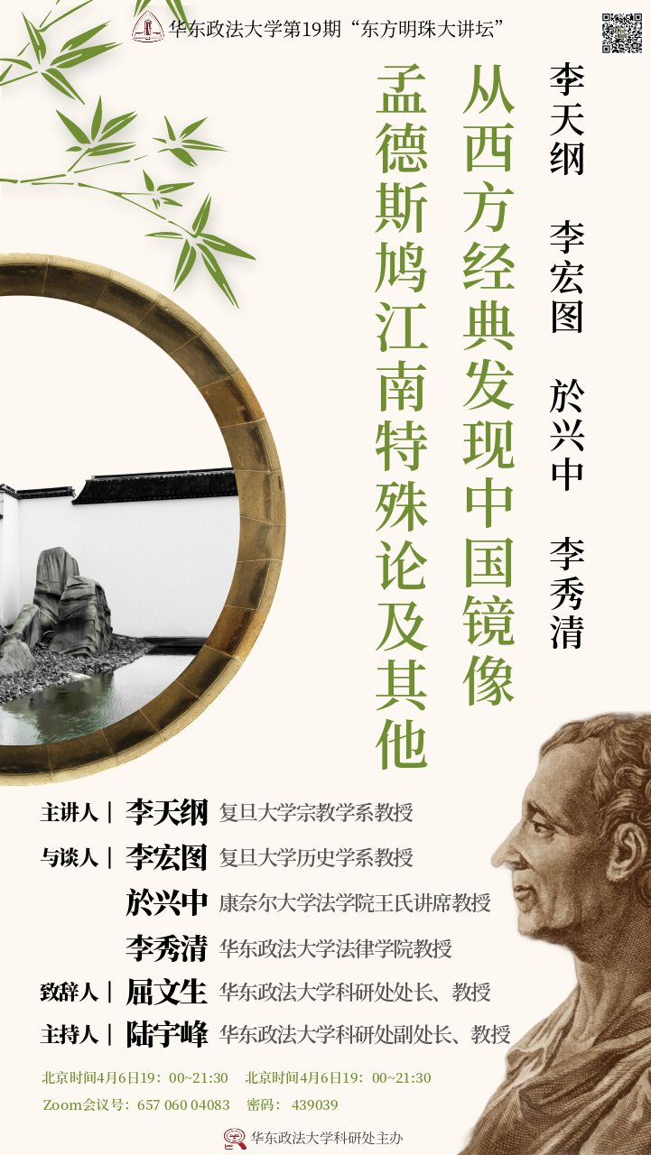 早期西方研读中国,大致遵循三条路径:观礼仪,译儒典,是为伏尔泰氏等文化仰慕流派之渊薮;探贸易,察食货,则启亚当·斯密社会经济分析之脉络;而孟德斯鸠另辟蹊径,置中国于普世性政体理论之中,考地理,原政制,更新西方传统古典政体之说。本期大讲坛有幸邀请到复旦大学宗教学系李天纲教授,以孟德斯鸠江南特殊论为切入点,梳理中国镜像构成及其对于欧洲思想的贡献。复旦大学历史学系李宏图教授长期研究启蒙运动与欧洲近代思想史,他将阐释十八世纪启蒙运动中中国的影响,与李天纲教授展开对话。同样荣幸的是,本期大讲坛也邀请到知名法理学家、康奈尔大学法学院王氏讲席教授於兴中,以及知名法律史学家、taptap点点法律学院教授李秀清与谈。taptap科研处处长屈文生教授等专家学者将参加本次大讲坛,讲座由科研处副处长陆宇峰教授主持。