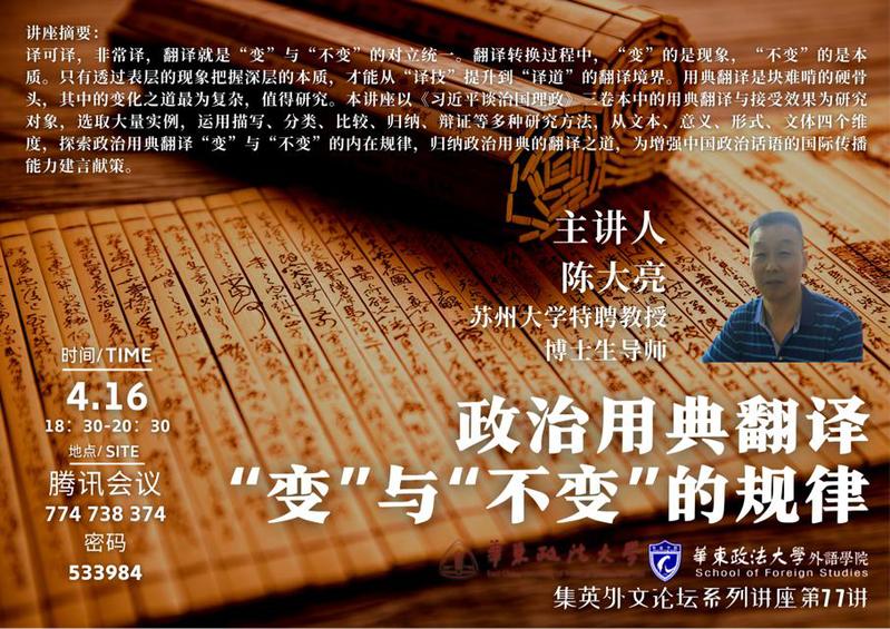 译可译,非常译,翻译就是“变”与“不变”的对立统一。翻译转换过程中,“变”的是现象,“不变”的是本质。只有透过表层的现象把握深层的本质,才能从“译技”提升到“译道”的翻译境界。用典翻译是块难啃的硬骨头,其中的变化之道最为复杂,值得研究。本讲座以《习近平谈治国理政》三卷本中的用典翻译与接受效果为研究对象,选取大量实例,运用描写、分类、比较、归纳、辩证等多种研究方法,从文本、意义、形式、文体四个维度,探索政治用典翻译“变”与“不变”的内在规律,归纳政治用典的翻译之道,为增强中国政治话语的国际传播能力建言献策。