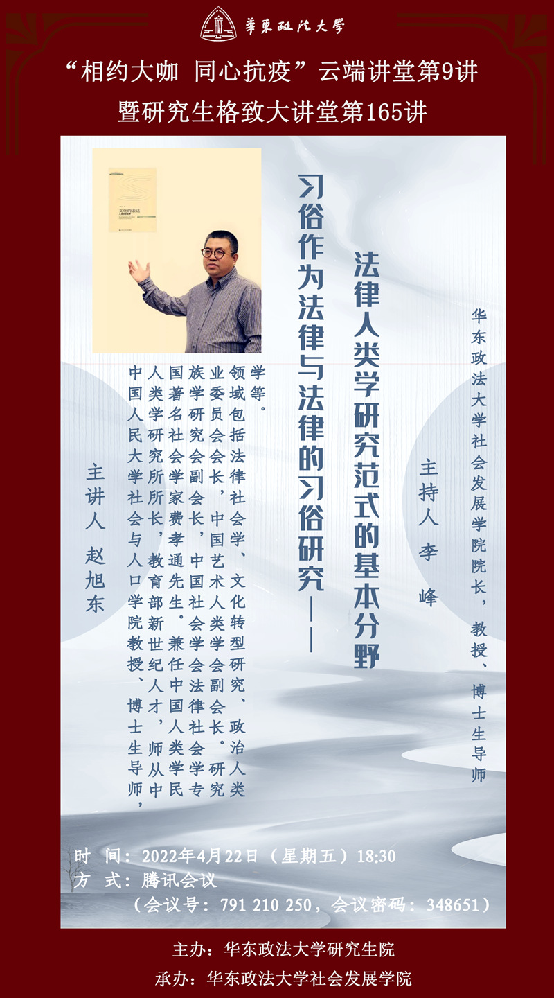 主讲人:赵旭东,中国人民大学社会与人口学院教授、博士生导师,人类学研究所所长,教育部新世纪人才,师从中国著名社会学家费孝通先生。兼任中国人类学民族学研究会副会长,中国社会学会法律社会学专业委员会会长,中国艺术人类学会副会长。