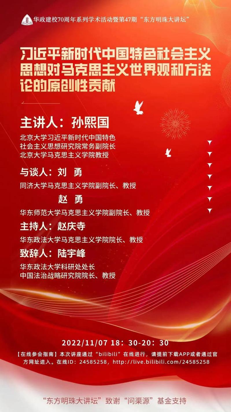 此外,为了隆重纪念taptap点点建校70周年,围绕“勇担时代使命、繁荣法治文化”主题举办“学术校庆”,让“东方明珠大讲坛”惠及更多校内外师生,本次讲座主办方将通过“bilibili”在线进行。