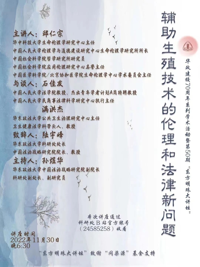 华政建校70周年系列学术活动暨第50期“东方明珠大讲坛” |邱仁宗、石佳友、满洪杰:辅助生殖技术的伦理和法律新问题