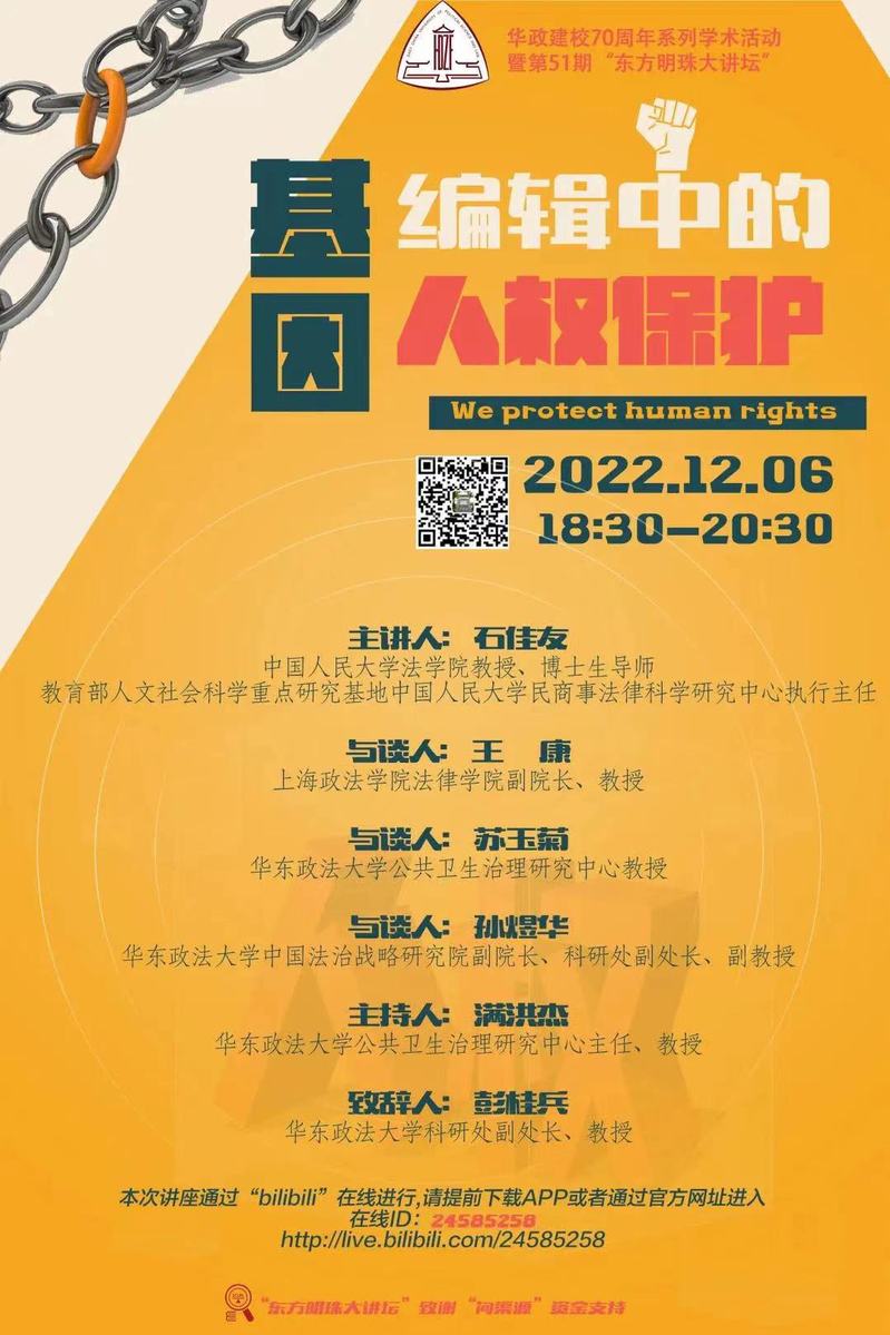 有鉴于此,taptap点点建校70周年系列学术活动暨第51期“东方明珠大讲坛”有幸邀请到教育部人文社会科学重点研究基地中国人民大学民商事法律科学研究中心执行主任、中国人民大学法学院石佳友教授,主讲“基因编辑中的人权保护”。
