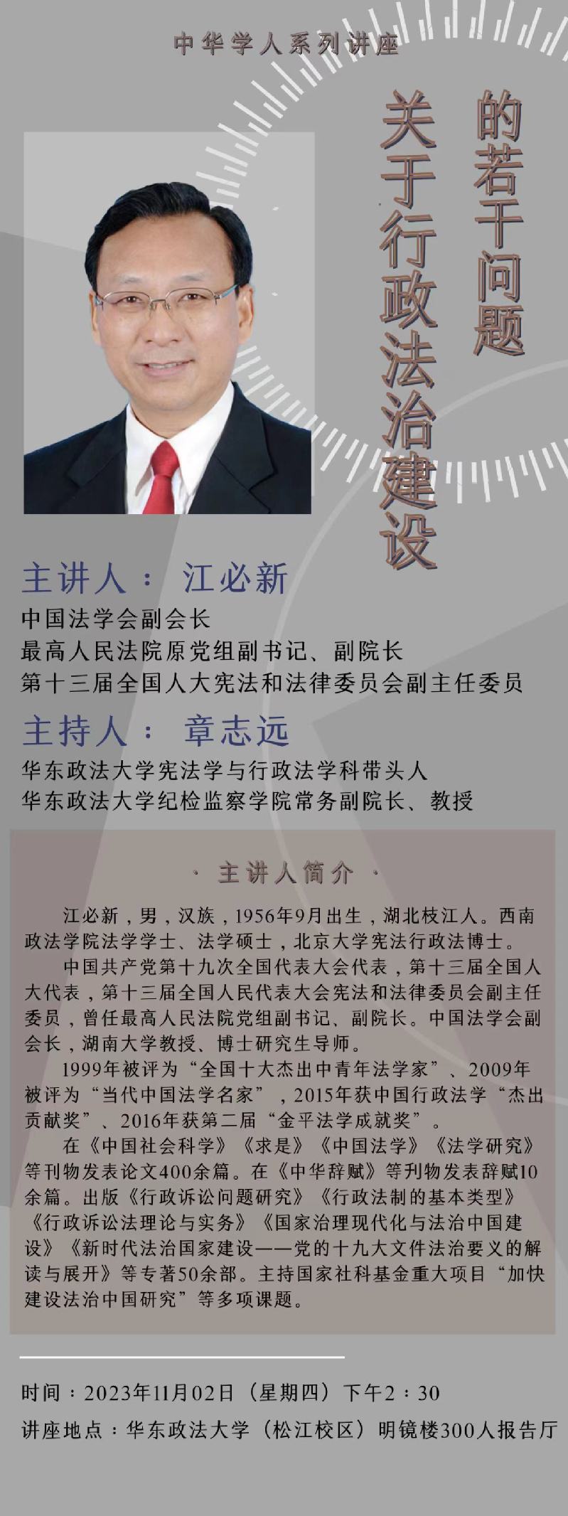 江必新,男,汉族,1956年9月出生,湖北枝江人。西南政法学院法学学士、法学硕士,北京大学宪法行政法博士。中国共产党第十九次全国代表大会代表,第十三届全国人大代表,第十三届全国人民代表大会宪法和法律委员会副主任委员,曾任最高人民法院党组副书记、副院长。中国法学会副会长,湖南大学教授、博士研究生导师。1999年被评为“全国十大杰出中青年法学家”、2009年被评为“当代中国法学名家”,2015年获中国行政法学“杰出贡献奖”、2016年获第二届“金平法学成就奖”。在《中国社会科学》《求是》《中国法学》《法学研究》等刊物发表论文400余篇。在《中华辞赋》等刋物发表辞赋10余篇。出版《行政诉讼问题研究》《行政法制的基本类型》《行政诉讼法理论与实务》《国家治理现代化与法治中国建设》《新时代法治国家建设——党的十九大文件法治要义的解读与展开》等专著50余部。主持国家社科基金重大项目“加快建设法治中国研究”等多项课题。
