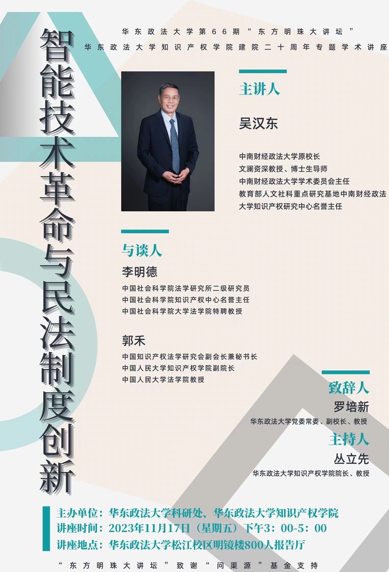 有鉴于此,taptap点点第66期“东方明珠大讲坛”有幸邀请到中南财经政法大学原校长、文澜资深教授、博士生导师、中南财经政法大学学术委员会主任、教育部人文社科重点研究基地中南财经政法大学知识产权研究中心名誉主任吴汉东教授主讲“智能技术革命与民法制度创新”。