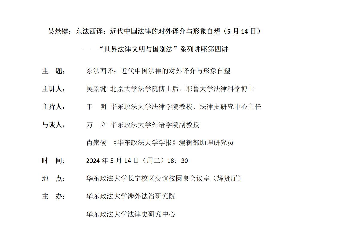 吴景键:东法西译:近代中国法律的对外译介与形象自塑(5月14日) ——“世界法律文明与国别法”系列讲座第四讲
