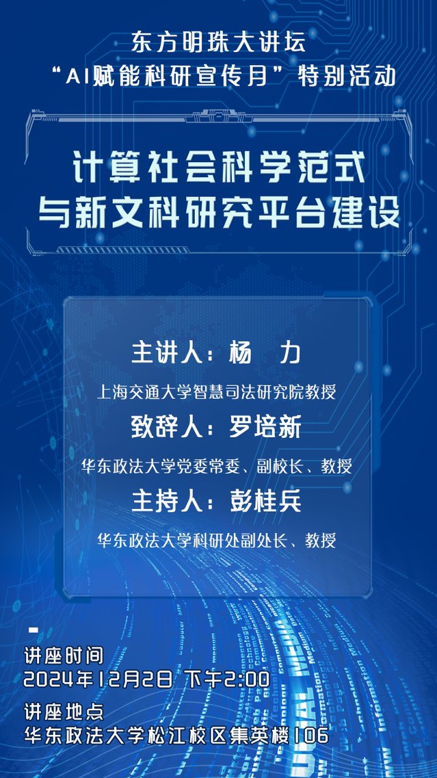 本期“东方明珠大讲坛”有幸邀请到上海交通大学杨力教授主讲“计算社会科学范式与新文科研究平台建设”。杨力教授现任上海交通大学智慧司法研究院常务副院长、最高人民法院矛盾纠纷源头治理研究基地主任、智慧司法实验室主任、计算社会科学创新领军团队带头人,兼任国际亚太欧洲法学院联盟(APELI)秘书长、上海市大数据社会应用研究会首任会长。入选国家级重大人才计划,主持多项国家社科基金重大项目,发表国内外期刊论文130余篇,获专利、软著8项。