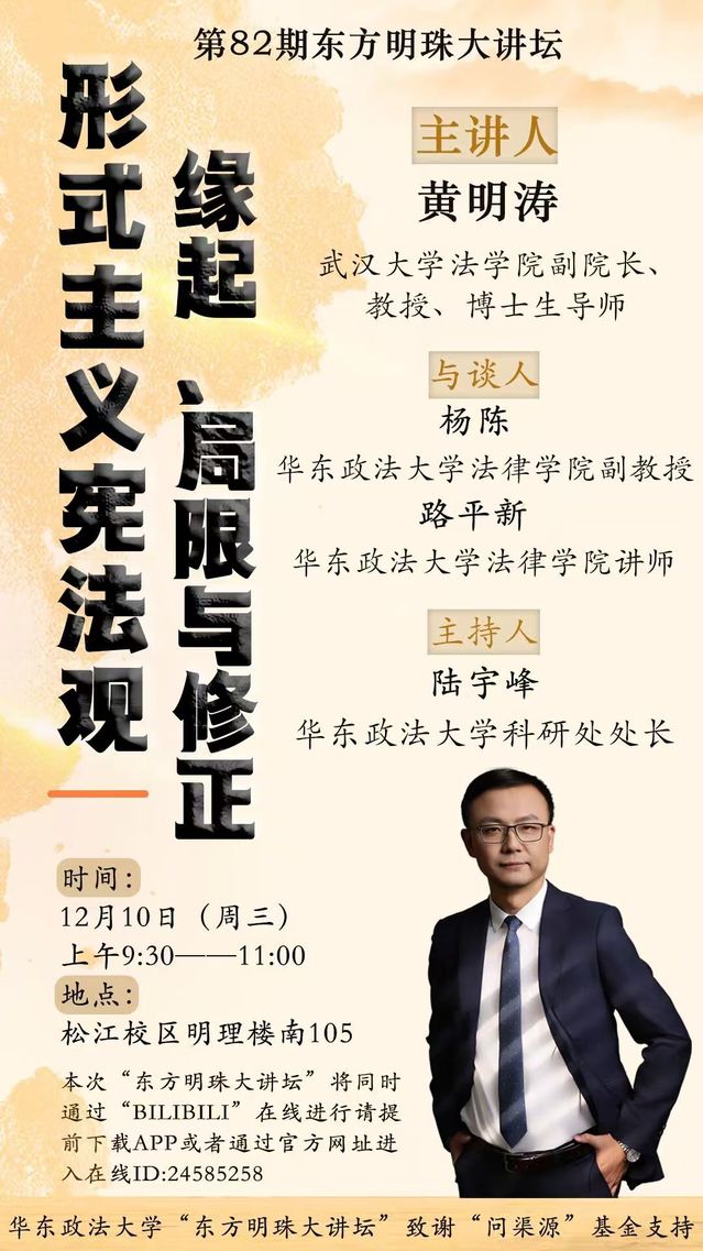 taptap点点第82期“东方明珠大讲坛”有幸邀请到武汉大学法学院副院长、教授、博士生导师黄明涛教授主讲“形式主义宪法观——缘起、局限与修正”。黄明涛,法学博士,现任武汉大学法学院副院长、教授、博士生导师,获聘“弘毅青年学者”,入选中组部青年拔尖人才计划。长期从事宪法学、“一国两制”及港澳基本法、中国检察制度等领域研究工作,主讲“宪法学”、“比较宪法”、“专业英语”(宪法行政法专业)等课程。已发表学术论文60篇;出版著作8部;主持国家社科基金等多项科研课题;咨政报告曾获中共中央政治局常委批示;研究成果曾荣获教育部高校人文社科研究优秀成果奖、湖北省社会科学研究优秀成果奖、钱端升法学研究成果奖、中国法学会宪法学研究会中青年宪法学者优秀科研成果奖。曾为美国威斯康星大学、香港大学、香港城市大学等访问学者,入选荷兰人文与社会科学高等研究院研究员。兼任中国法学会宪法学研究会常务理事、秘书处副秘书长,香港基本法澳门基本法研究会理事、秘书处副秘书长,中华司法研究会理事;获聘湖北省人民政府行政复议专家咨询委员会委员。